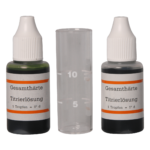 Messbesteck zur Messung der Wasserhärte in Grad deutscher Härte (°dH). Das Messbesteck reicht für ca. 600 °dH, d.h. bei einer Gesamthärte von 20 °dH können etwa 30 Titrationen durchgeführt werden.